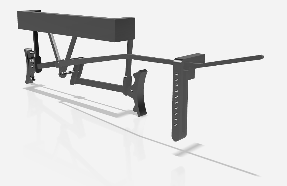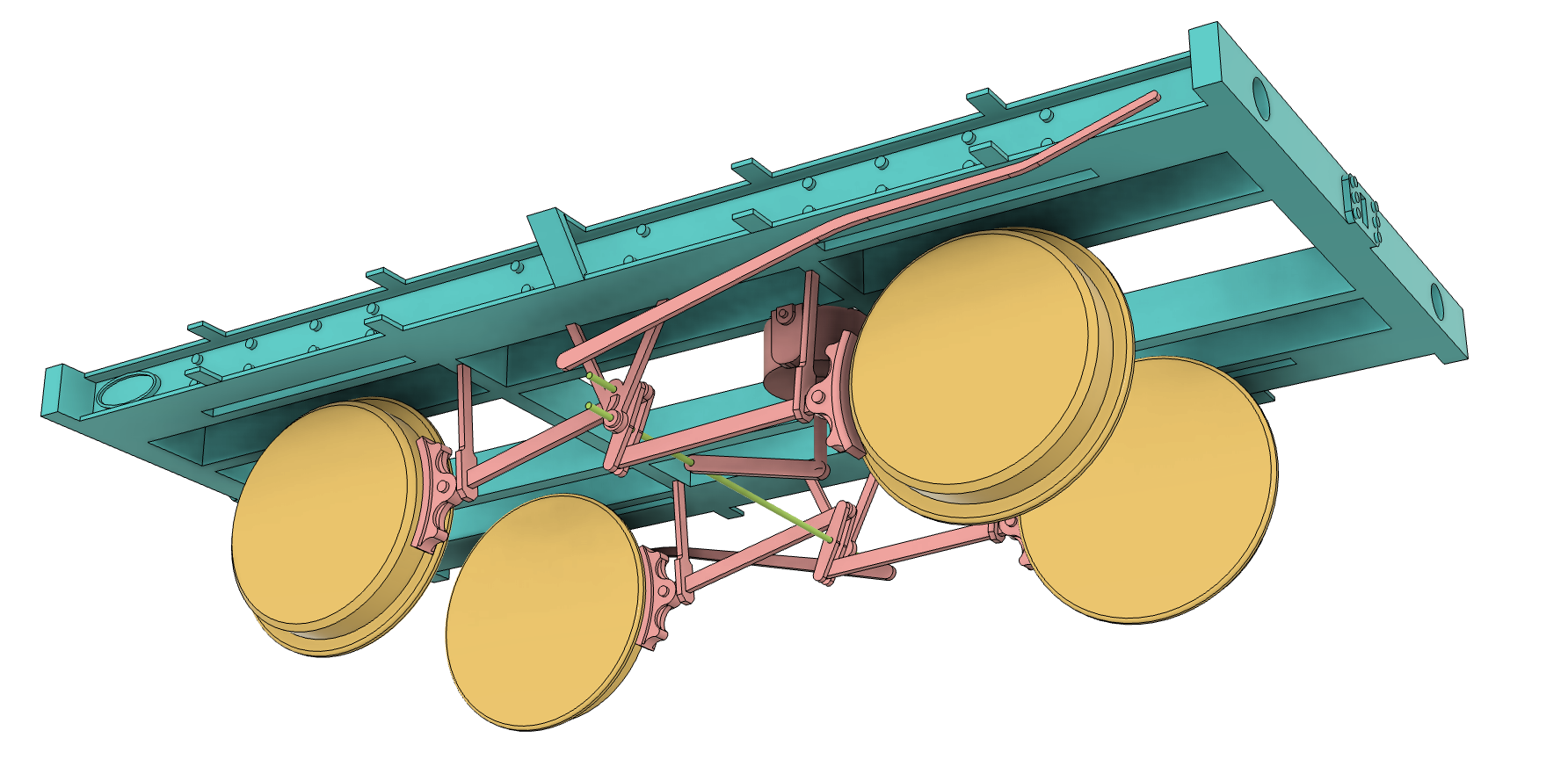 One of the more difficult components was the brake lever, since it bends and twists in all three axis, but with an extrude and intersect I got it working. Each side of the braking system is a single piece, including the brake handle and guide – the W-iron and rod hangers are attached to a plate which is inserted up into the recess of the floor.
