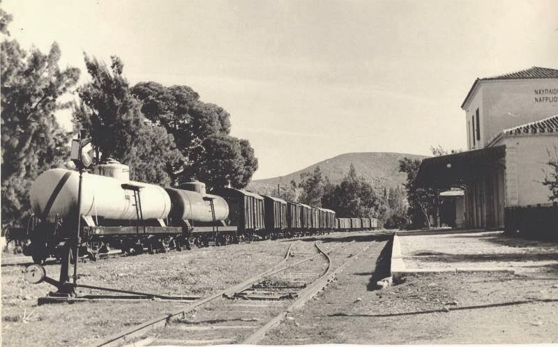 Though I cannot be sure from the photographic evidence, I believe box cars and flat cars would have been loaded at the station site, but tank cars would likely have been shunted to a separate siding. In the context of Napflio, this would almost certainly be a headshunt onto the port for trans-loading into ships to the various nearby islands.