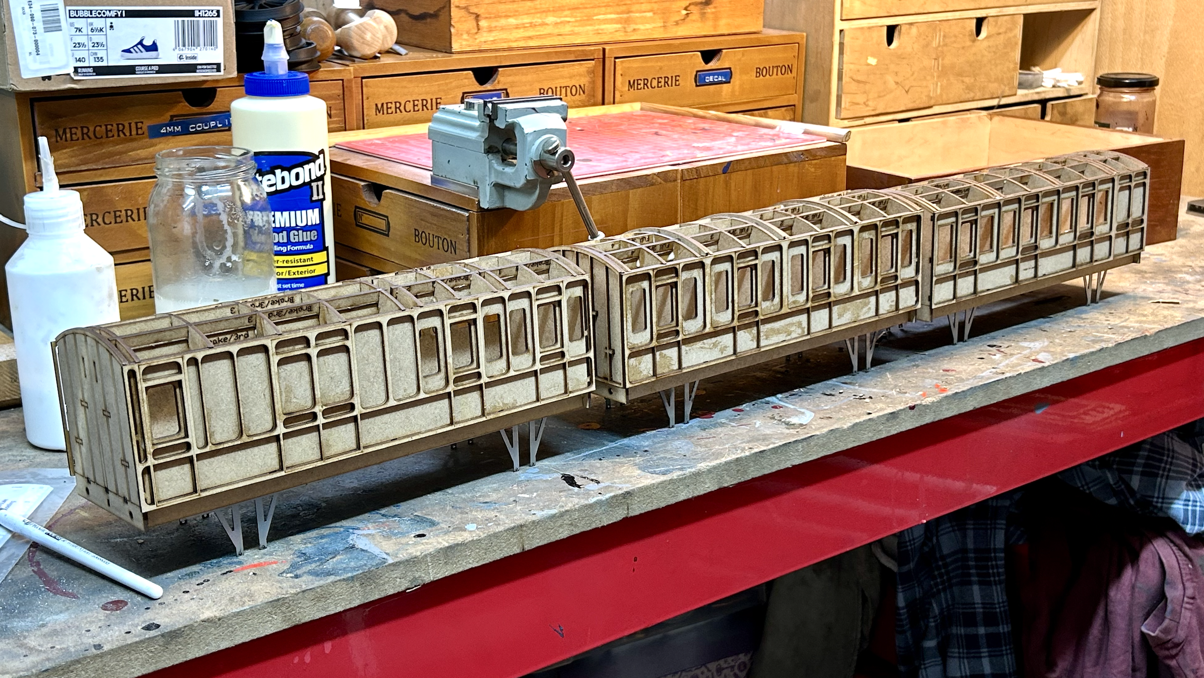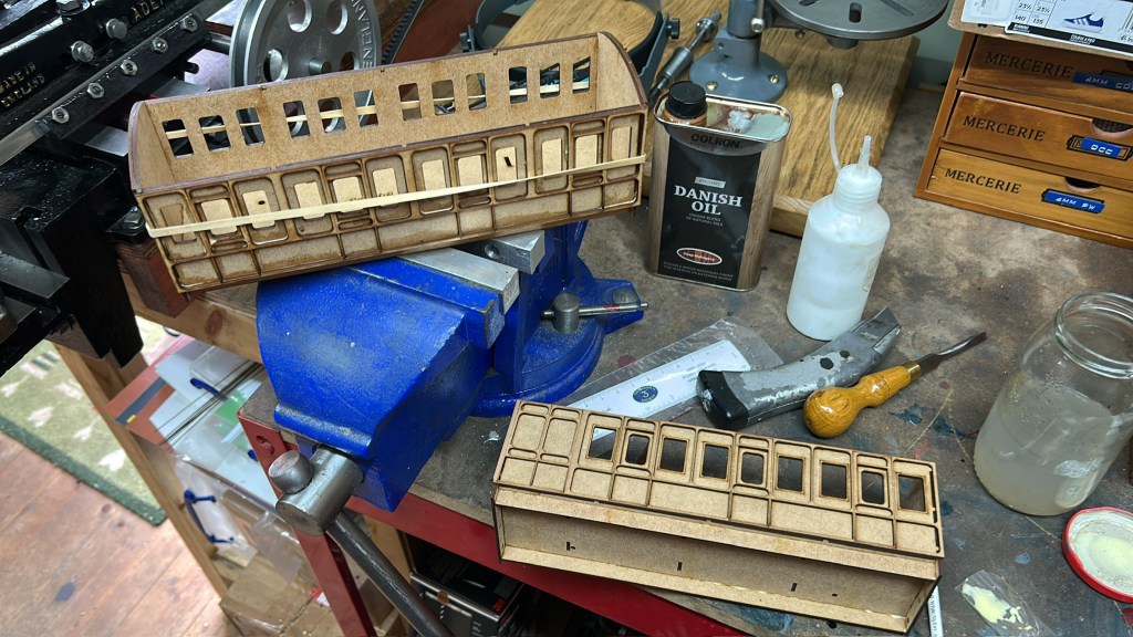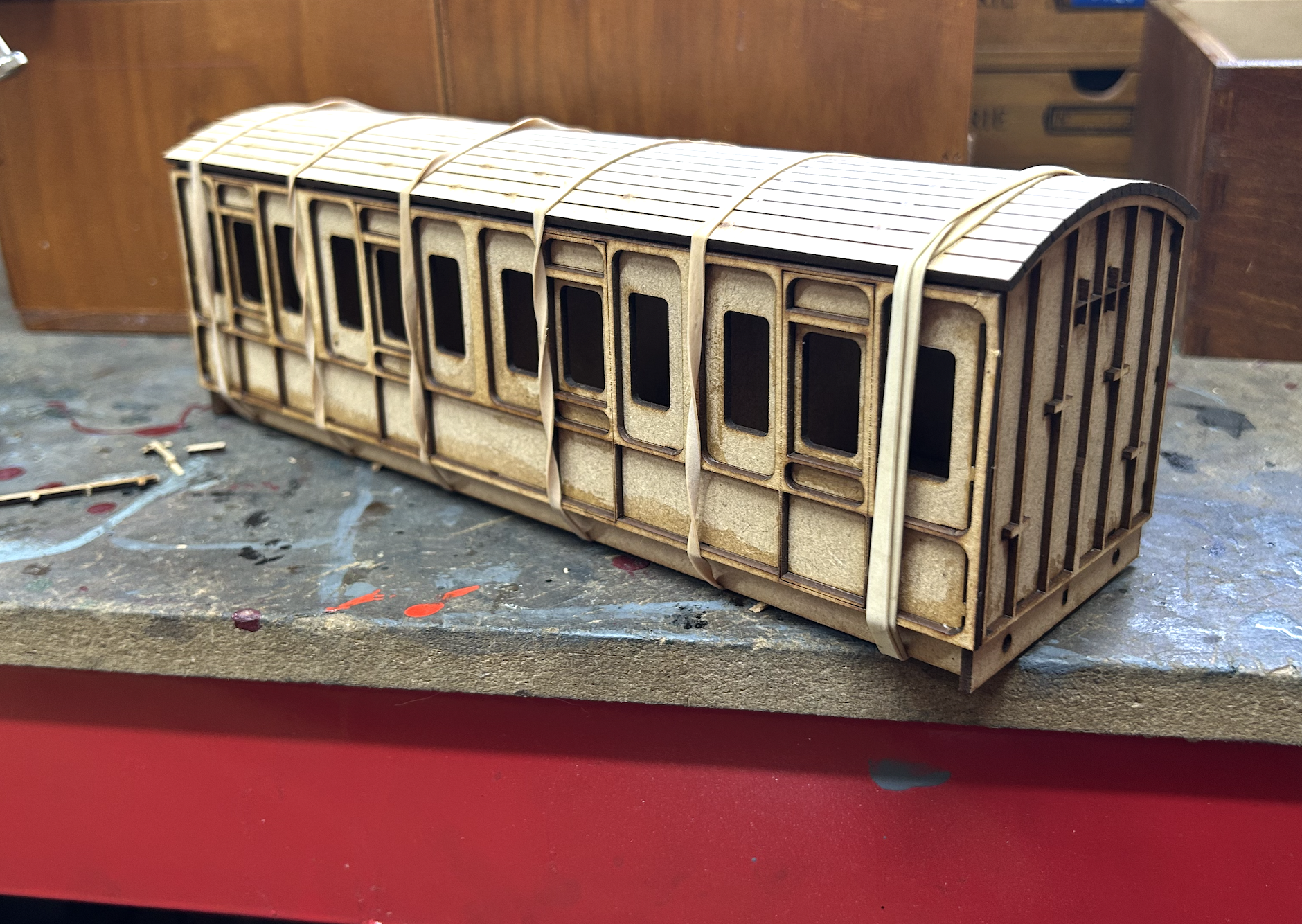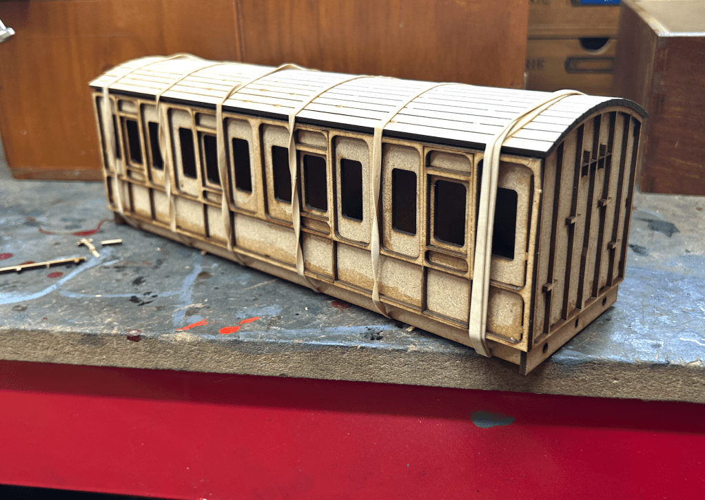 The roof of the carriages are also 1.5mm ply with lots of zig-zag cuts to increase flexibility – the internal framing was built and dry-installed into the carriage body, then glue applied to the top surface and the roof elastic-banded on top.