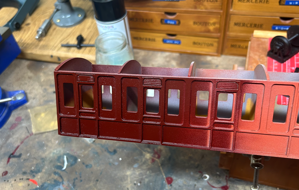 The underframes and bodies, being from two separate carriage kits didn’t align, so I spotted through with a 2.5mm drill, opened out the underframe holes to 3.2mm and then screwed together with M3 bolts.