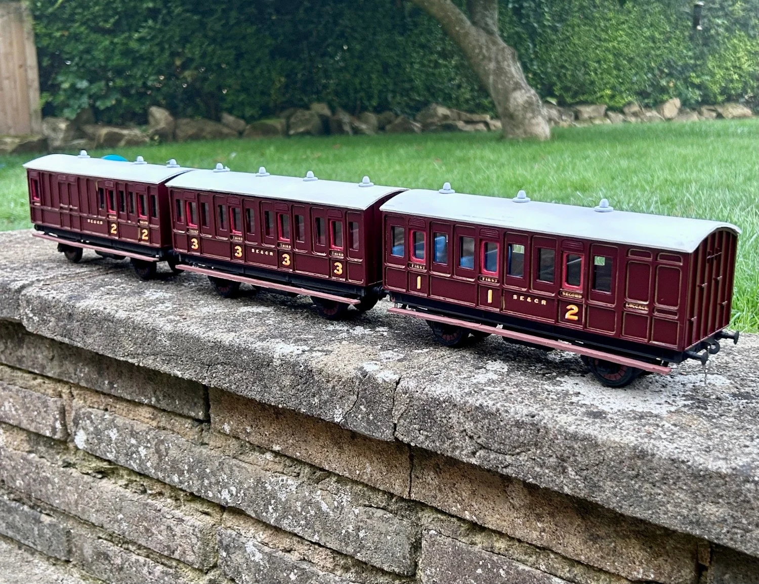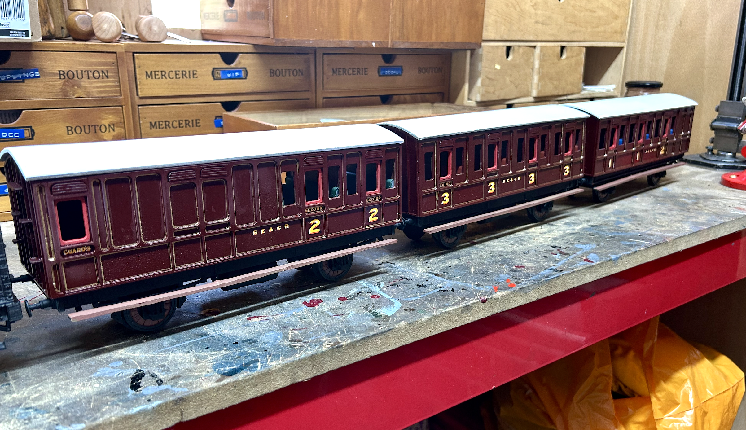 I am reliably informed that this style of moulding is found on LNWR, SER, FR, and B&NCR – and the SER/SECR being a local line definitely works for me: sharing a dark claret / purple lake colour scheme from approximately 1885 until the adoption of Wellington Brown as a WW1 austerity measure.