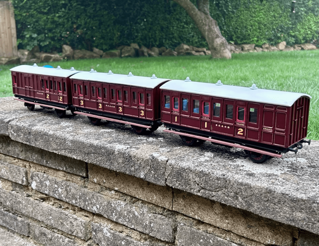 Ken West kits produced these carriages to use up a chassis produced for a brake van and so do not represent a specific prototype, the biggest tell is that these coaches have curved bolections/trim but do not have any kind of tumblehome, they are approximately 16′ wheelbase with a 25’6″ body.