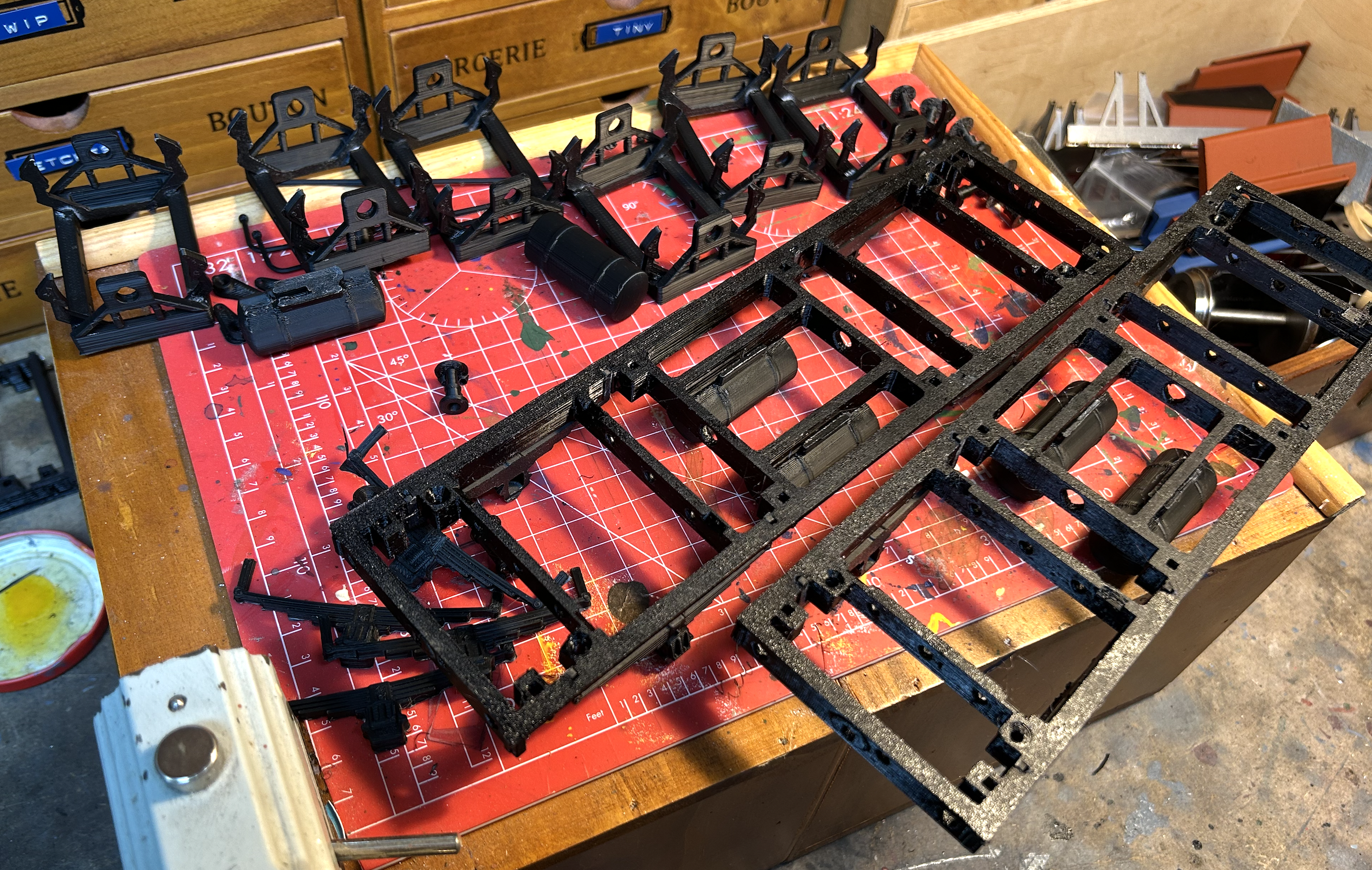 While there are printed hooks and chains available in the STL files for the underframe, I have so little luck printing with PETG (and such little toughness with PLA) that I decided to go with Walsall Model Industries three-link couplings. Not strictly correct, but robust and functional.