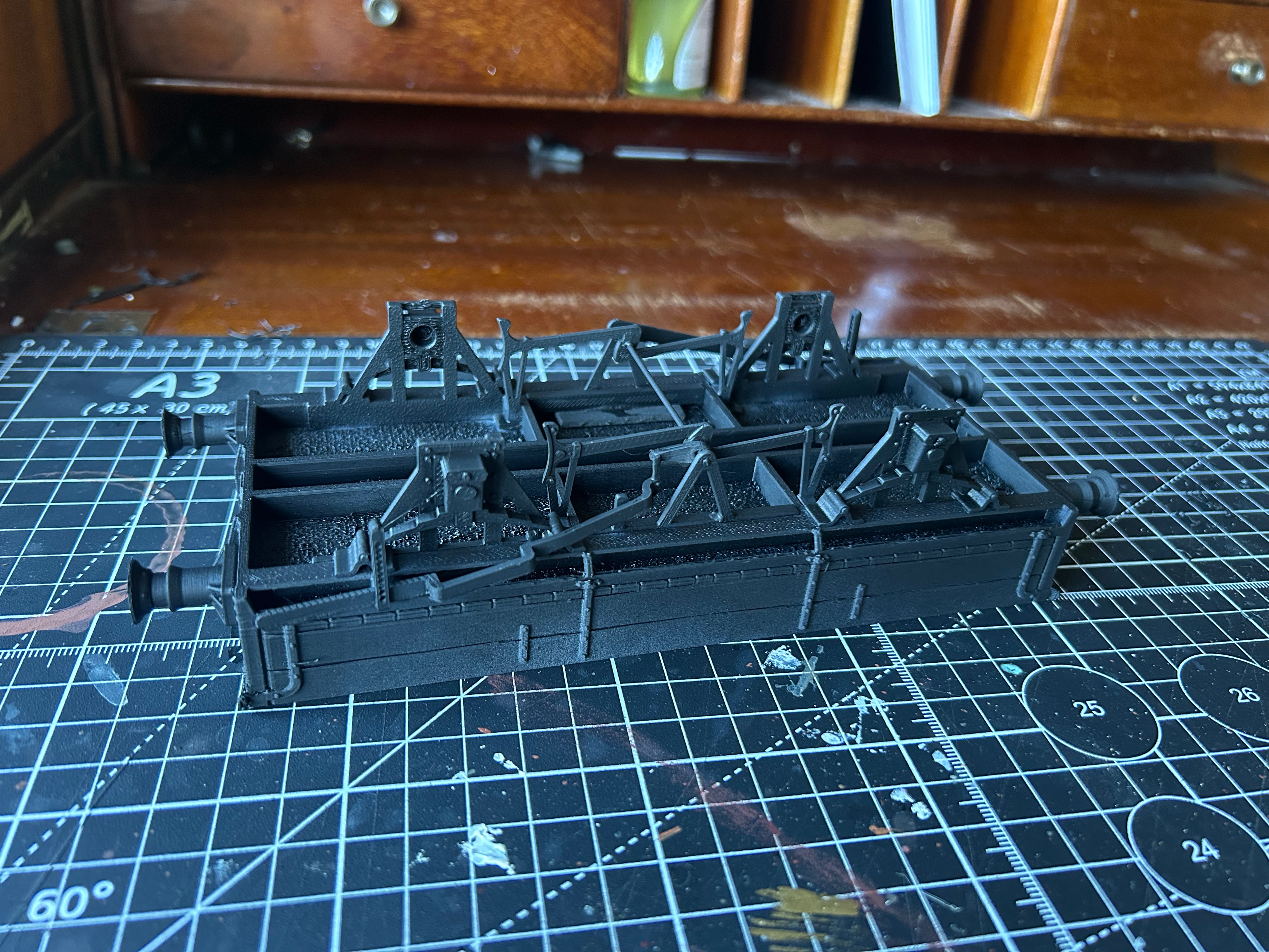 W-Iron design in G1 3D printing isn’t a solved problem yet, with lots of different competing designs, but these ones ‘just work’. To reduce lateral play I added a couple of bits of 1mm styrene onto the inside face of the axlebox recesses, but hardly neccesary.