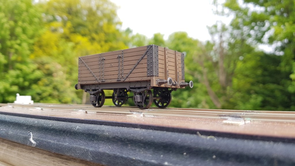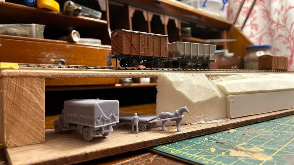 A slightly more evocative shot is a little test plank with some more 3D printed vehicles and some wagon kits – the plank has been subsequently re-purposed to test my automatic uncoupling mechanisms.