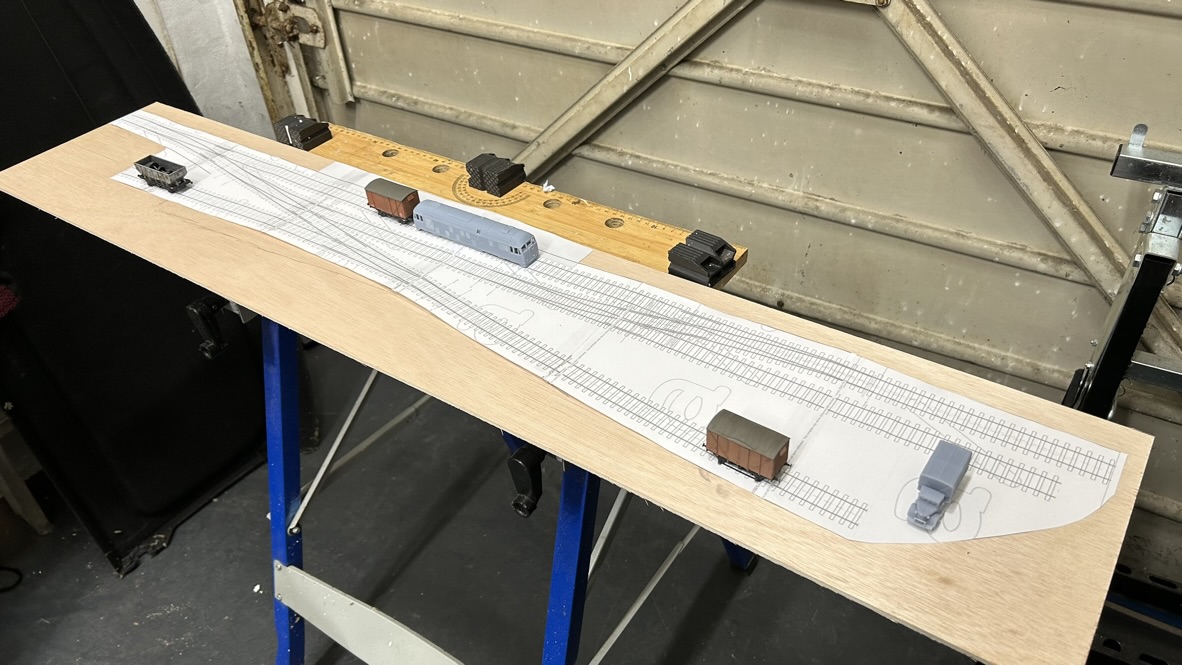 A slightly more evocative shot is a little test plank with some more 3D printed vehicles and some wagon kits – the plank has been subsequently re-purposed to test my automatic uncoupling mechanisms.