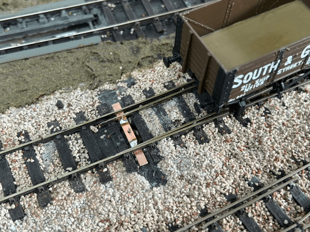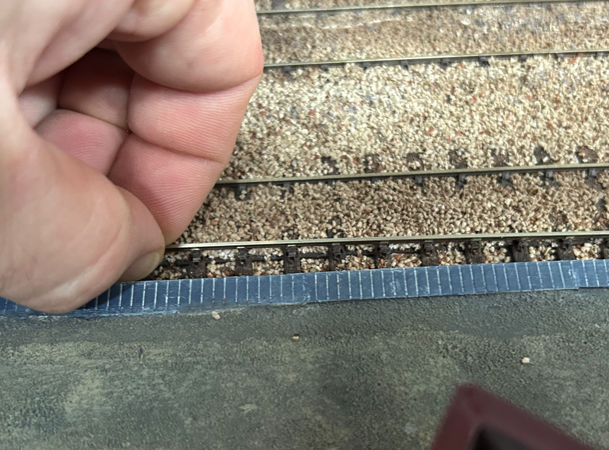 I’ve had my ‘ol reliable #579 running up and down the foreground of the layout with reasonable success, but before much further testing on P1/P2 and the ‘up’ side of the throat, i need to fix this rail. I’ve got some rail gauges on the printer which should hold it at the correct spacing while I glue it back in place.