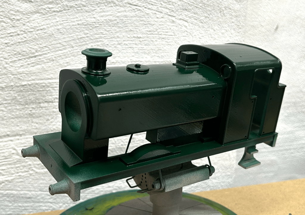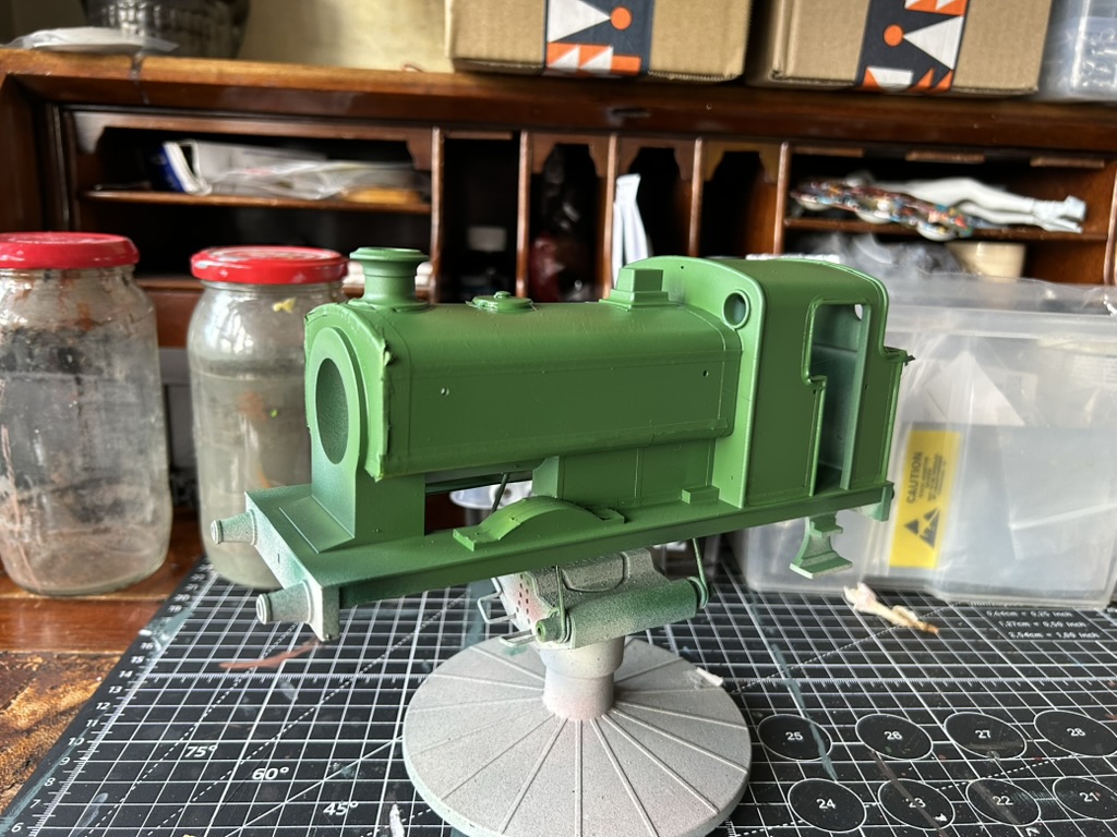 The locomotive body was undercoated in spray putty to take out the most egregious surface finish marks, and then painted in dark GNR green.