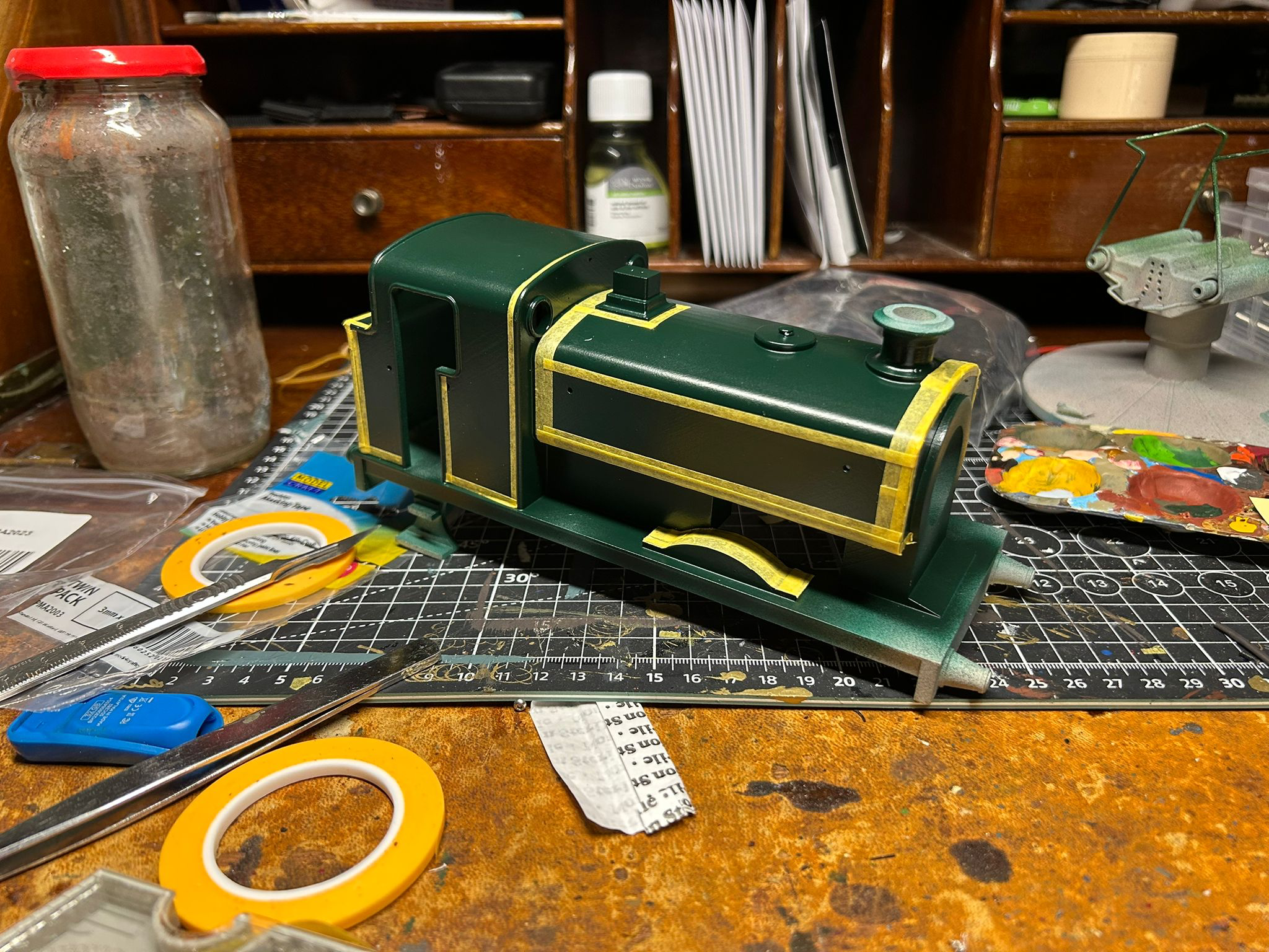 After the dark green had hardened for a couple of days, a combination of 2mm and 3mm masking tape of both standard and flexible types was obtained and used to mask the panel borders.