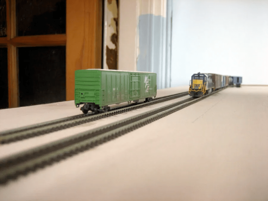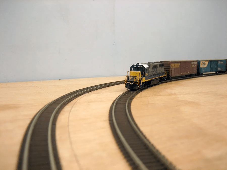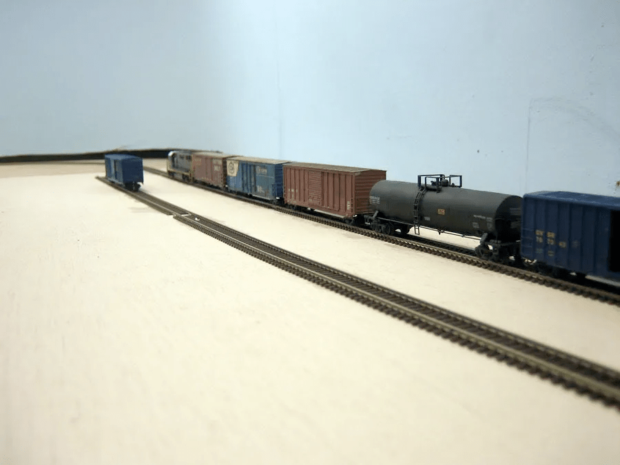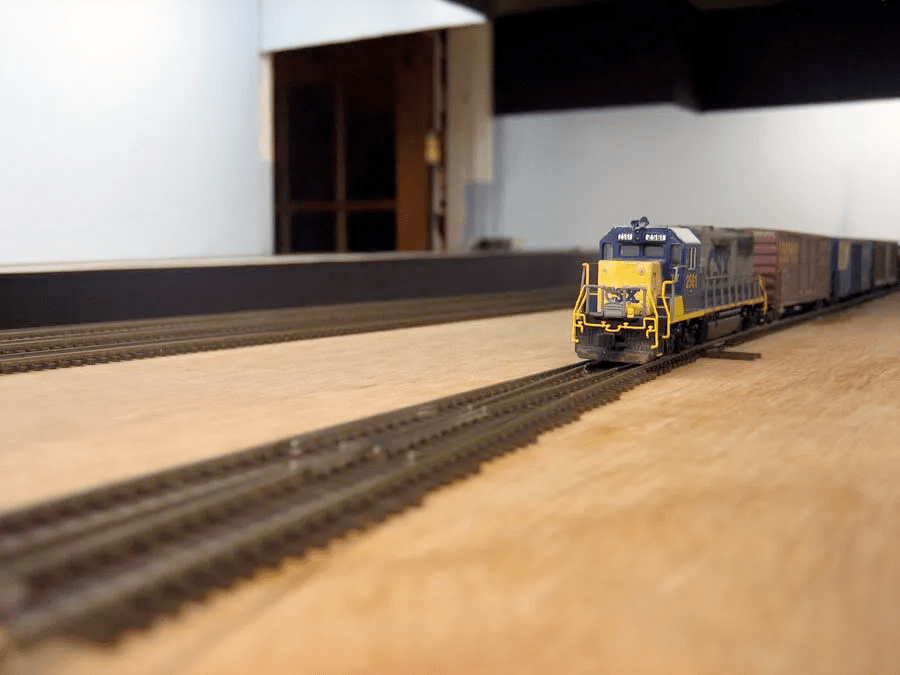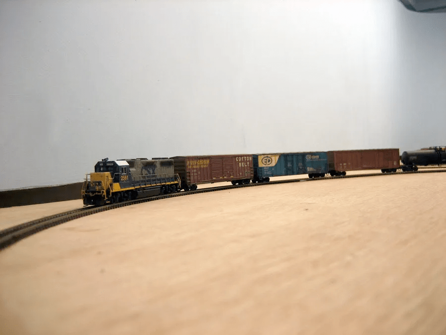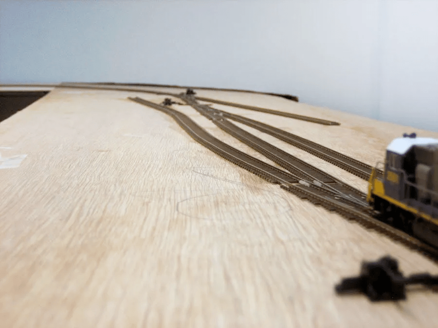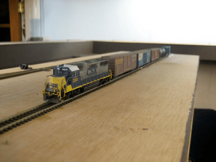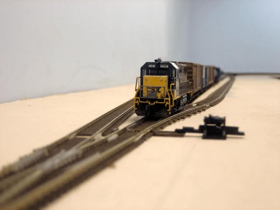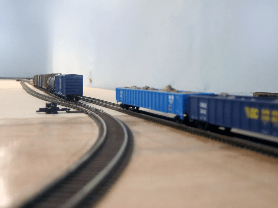 This layout is a distributed switching layout, occupying almost 40 linear feet of space for a single switching area. The area is criss-crossed by roads which can’t be blocked, and must be protected by flares before crossing. The cars are switched using CC/WB (in theory used as a mechanism to create a mimickry of a real-life CSX switchlist) for the single switching job which starts and terminates on the mainline at the end of the peninsula.