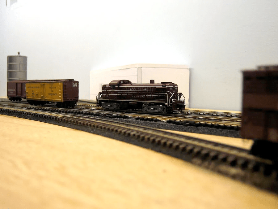 The Rock Island interchange track is the busiest industry on the layout, with I imagine around 5-8 cars per session going through it, however without a dedicated runaround track it becomes difficult to handle. A compromise I made on the design was for the Rock Island interchange to be a single line and for the CRIP to use the sidings in down to run-around. What this means, however – is that the RI train needs to propel RI-bound cars currently on the interchange into one siding while pulling SF-bound cars behind it. Then runaround and on the other track cut off the SF-bound cars, finish the runaround and couple to the RI-cars, runaround back to the opposite end of the SF-bound cars and then reverse back onto the interchange, cutting off the SF-bound cars on the way before returning to home territory – ALOT of running around!