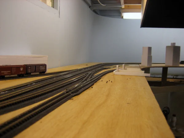 Because the staging was so huge (providing for four trains in either direction plus locals, plus RI trains, plus passenger trains) it created a situation where half of my layout room was off-scene in staging, and made the layout less an exercise in modelling the mainline and more an exercise in shoehorning as much operation in a town with no terminating or originating trains and twenty times the through-trains compared to those that stopped. Despite my best efforts I was unable to shake the feeling that I was compromising too much again, this time in the layout/staging ratio and the incredible lengths I was going to, to operate the layout like a switching plank.