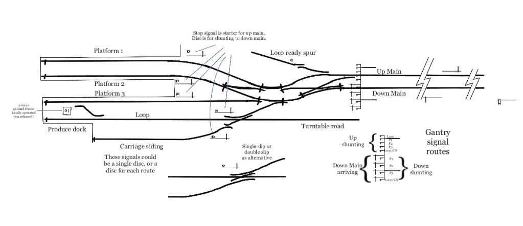 - An additional siding on the throat becomes a runaround for the front road, on which a double slip provides access to a carriage siding and hard standing area