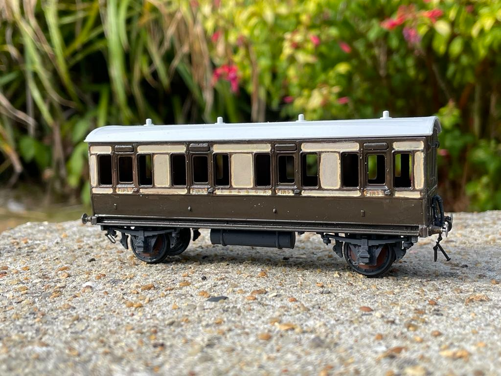 My first attempt to paint the LBSCR umber and cream scheme was on this convered Ratio GWR Composite carriage. With scratchbuilt straight ends it roughly approximates a Billinton D95 Suburban First: