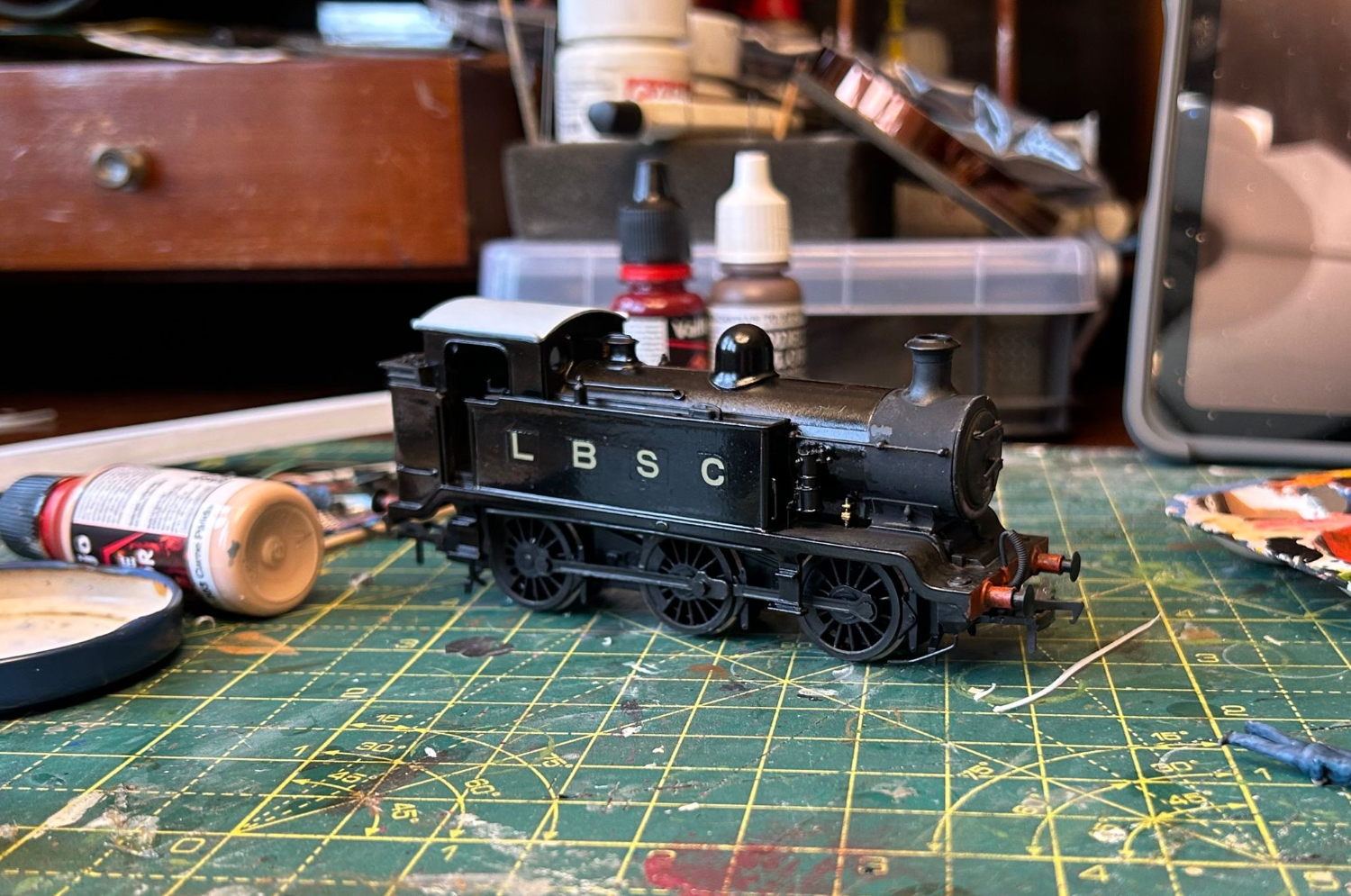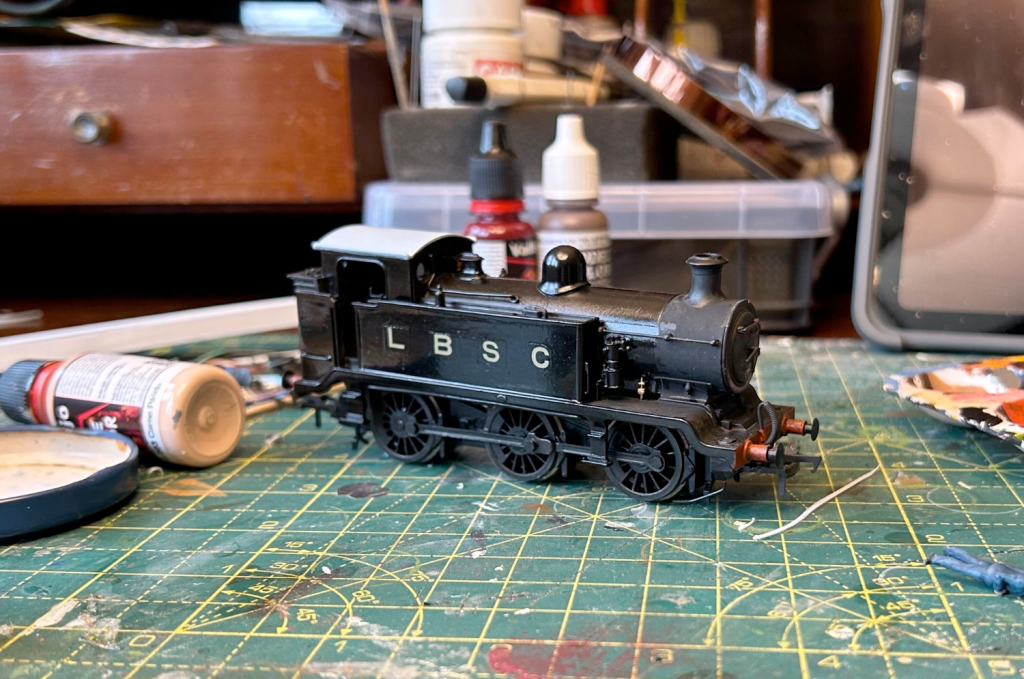 LBSC No. 103 would have been delivered in red-lined black at its introduction in 1913, so the model was cleaned thoroughly and sprayed with black aerosol primer. This was sealed with numerous coats of Future Floor Polish/Johnsons Klear to improve the surface for adhesion, and to better reflect the almost-pristine condition this loco would have been in.