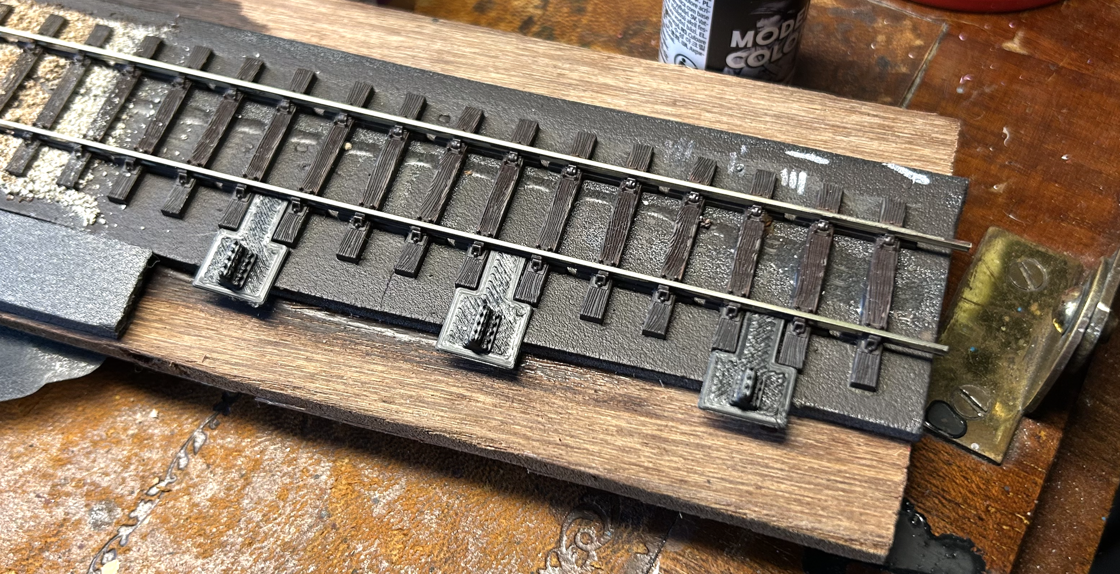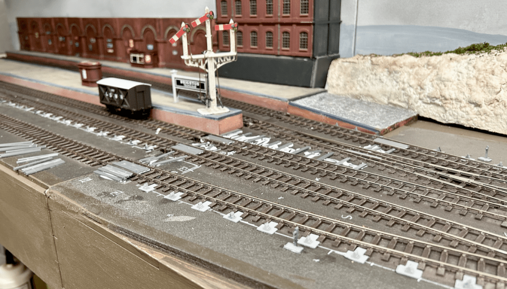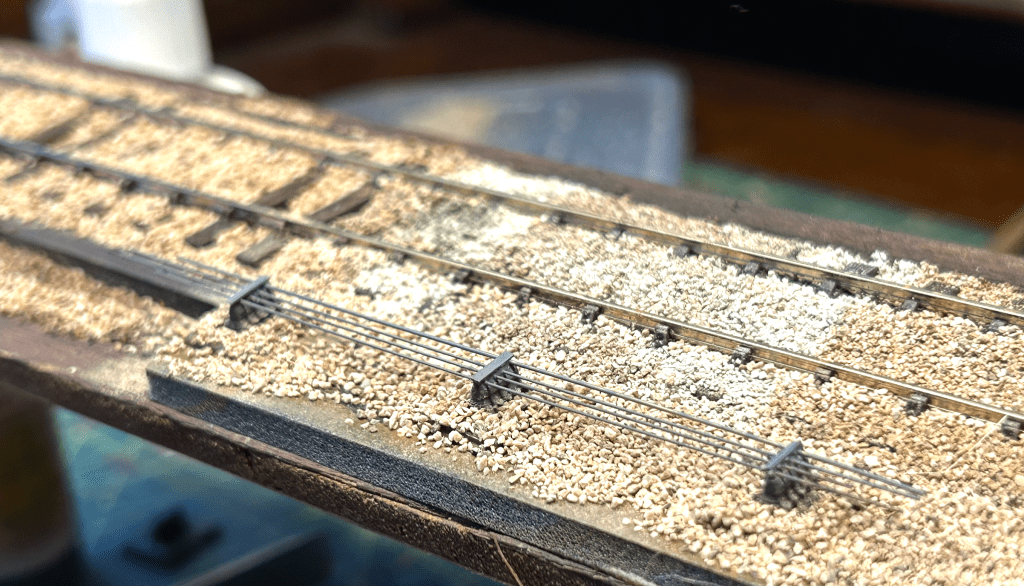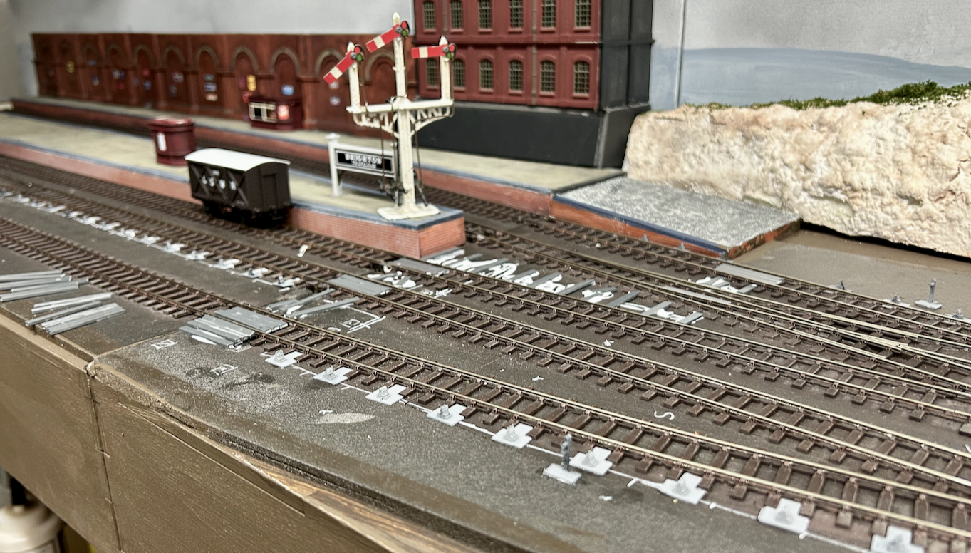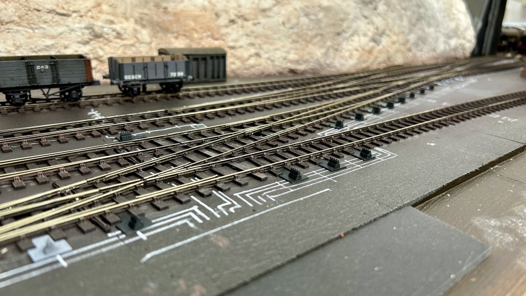 Point rodding rollers need to be closer together than you might think, around six to eight feet, so I decided to standardise spacing them between every three sleepers or timbers. It was difficult to plan the whole rodding run effectively, because I printed stools with one, two, three or four rollers – so these needed to be placed in the correct order as rods terminated at turnout linkages.