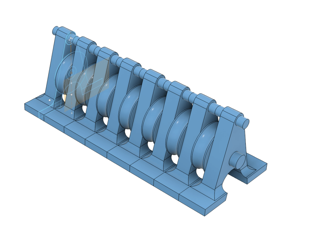 The rods have rollers every 8′ on straight sections and every 6′ on curves, and where there are parallel rods the rollers are grouped onto a stool consisting of a stand and axle, on which a number of rollers are mounted. Following the plotted lines, it was a simple process of establishing the number of rollers on each stool, and the number of stools thereof.