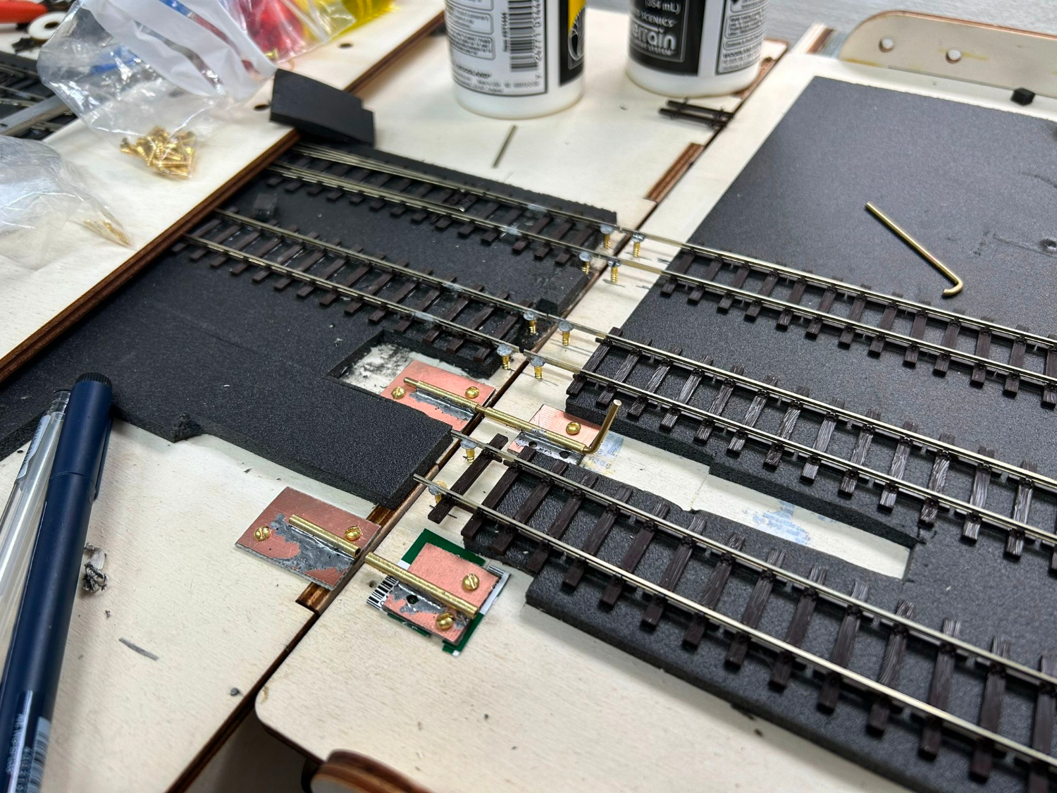 In an ideal world this layout would have mechanically actuated turnouts with a physical interlocking system. In practice, that is a year long project by itself and not conducive to maintaining at least a notional forward progress on the layout. Additionally, the implementation of mechanical actuation complicates exhibition significantly, so as a result I have gone with IP Digital motors and electronic point switching.