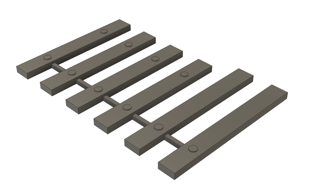 It quickly became evident that ensuring regular spacing underneath existing rails and without a reliable template would be challenging – but rather than drawing up a template and then using those same timbers, I modelled up the entire unit quickly in Fusion360: