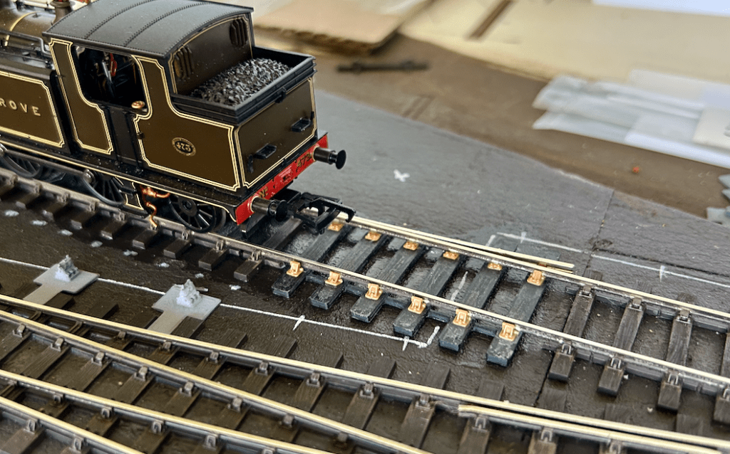 It was then simply a matter of carefully cutting away the moulded sleeper base underneath the track and sliding in the replacement timbers with the front half-chairs already fixed in place. A piece of rail was cut, filed and bent to shape with a standard chair threaded onto the diverging end, and then held in place against the rail while the slide chairs were inserted from the opposite side