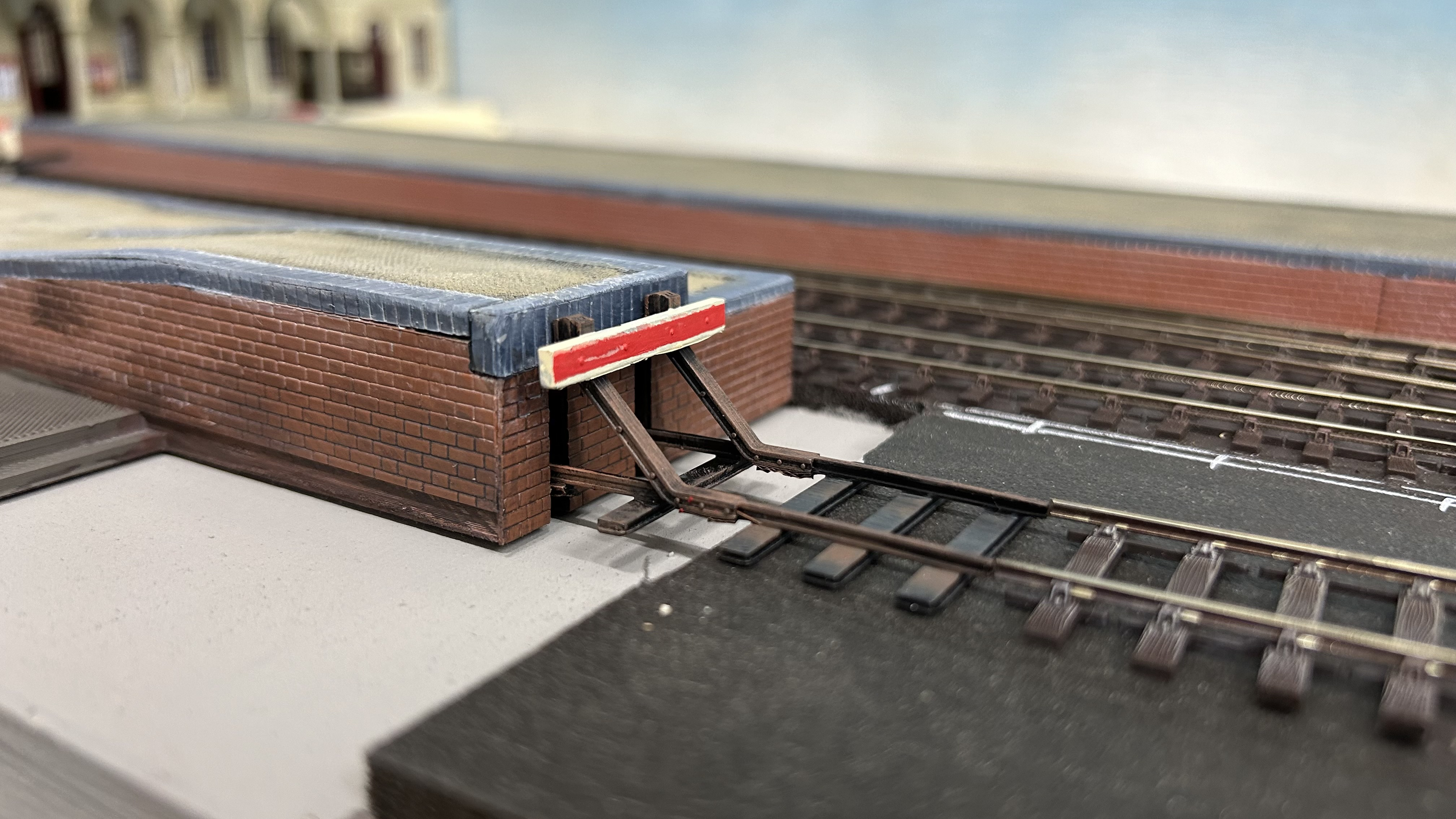 The platform-end buffers at Brighton Trafalgar are to the design shown at Central Croydon, which shows them being laid in slots in the masonry of the platforms. In order that these can be represented, I produced an abbreviated version of the same design that can be inserted into holes in the embossed styrene faces, but not so long that a significant excavation is required: